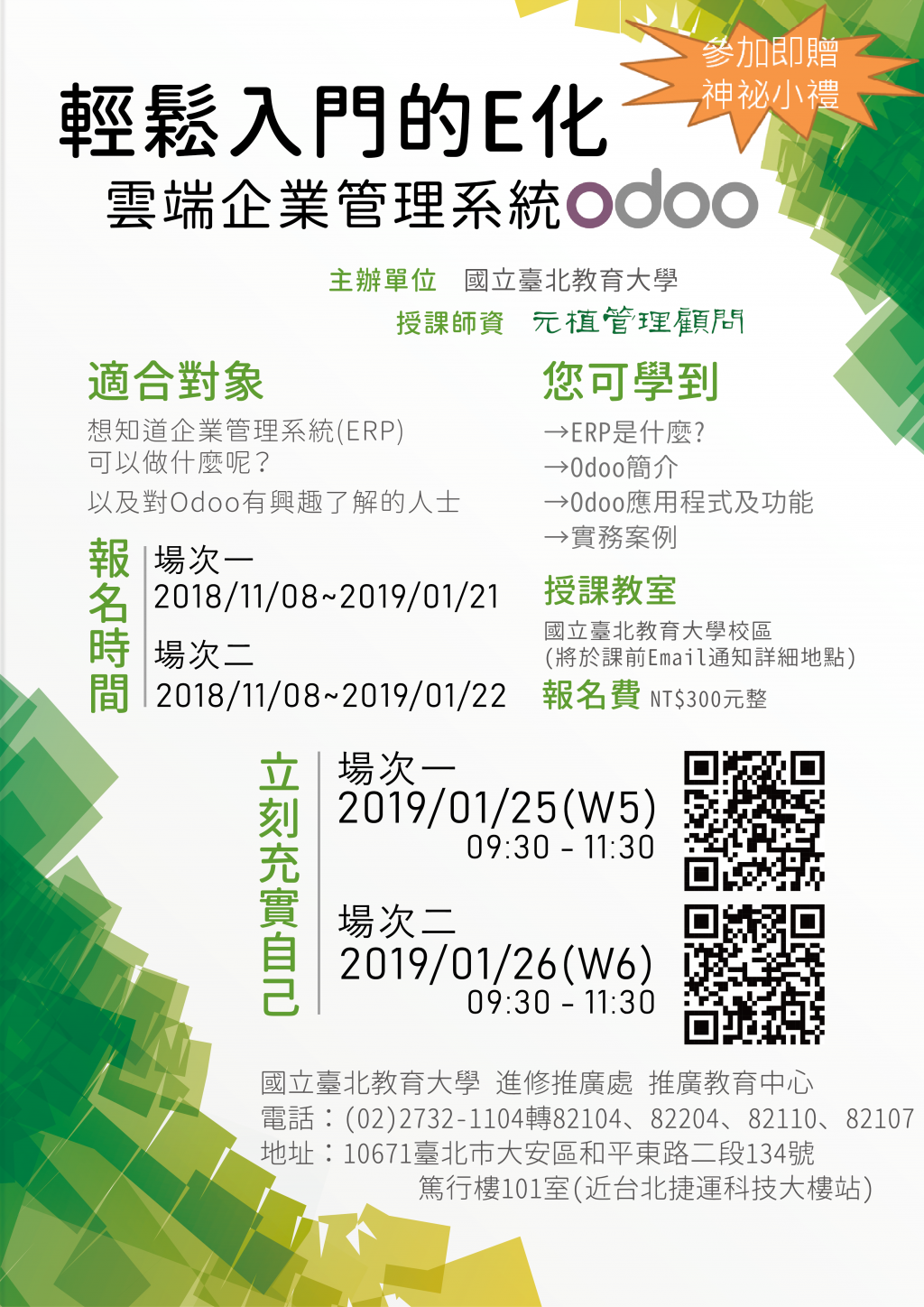 本講座可帶您初探系統之用途與如何自行查找網路上可使用的免費資源,擁有屬於自己的ERP工具及技能,畢業前送給自己的畢業禮物,不論是應用在學業或職場上,都非常值回票價!