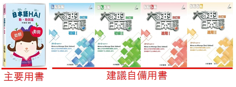 B. 建議自備(非必要)用書(開課後可原價8折團購):大新書局/大家的日本語 初級及進階共四冊(改訂版)