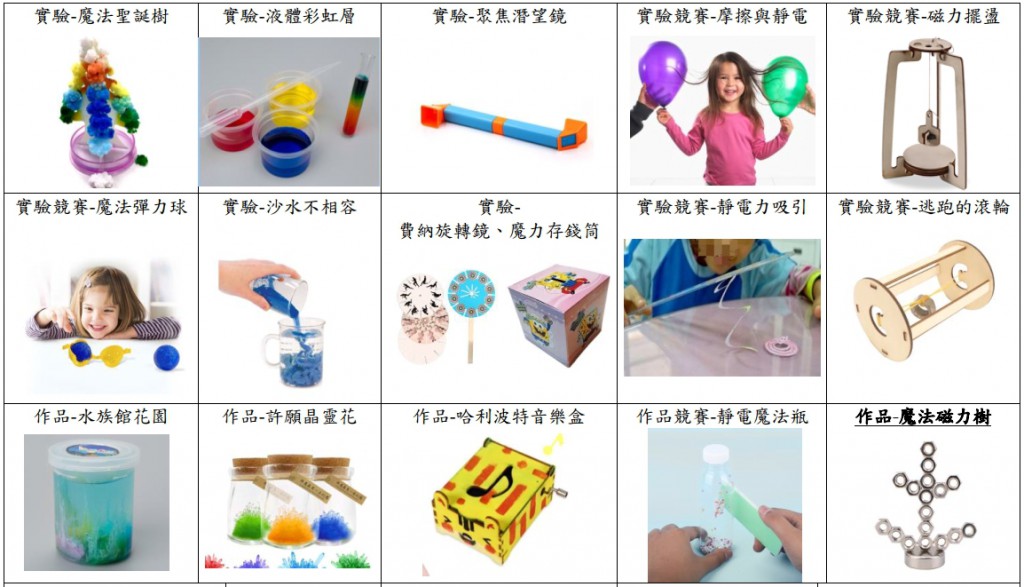 知識:化學變化、實驗:魔法聖誕樹、實驗競賽:魔法彈力球 作品:水族館花園
