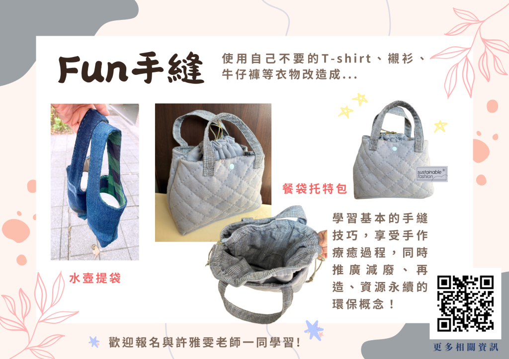 學習基本的手縫技巧,享受手作療癒過程,也能推廣減廢、再造、資源永續的環保概念。