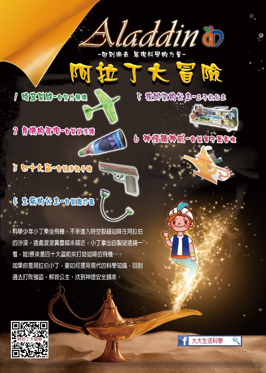 ★課程簡介:阿拉丁電影是許多人的記憶,本次課程以劇中人物故事為出發點,串起課程主軸,是一個讓孩子發揮創意,認識「STEAM」的科學手作課程;本次課程共有6項作品可帶回家,並藉由動手做,認識各式各樣的科學原理。