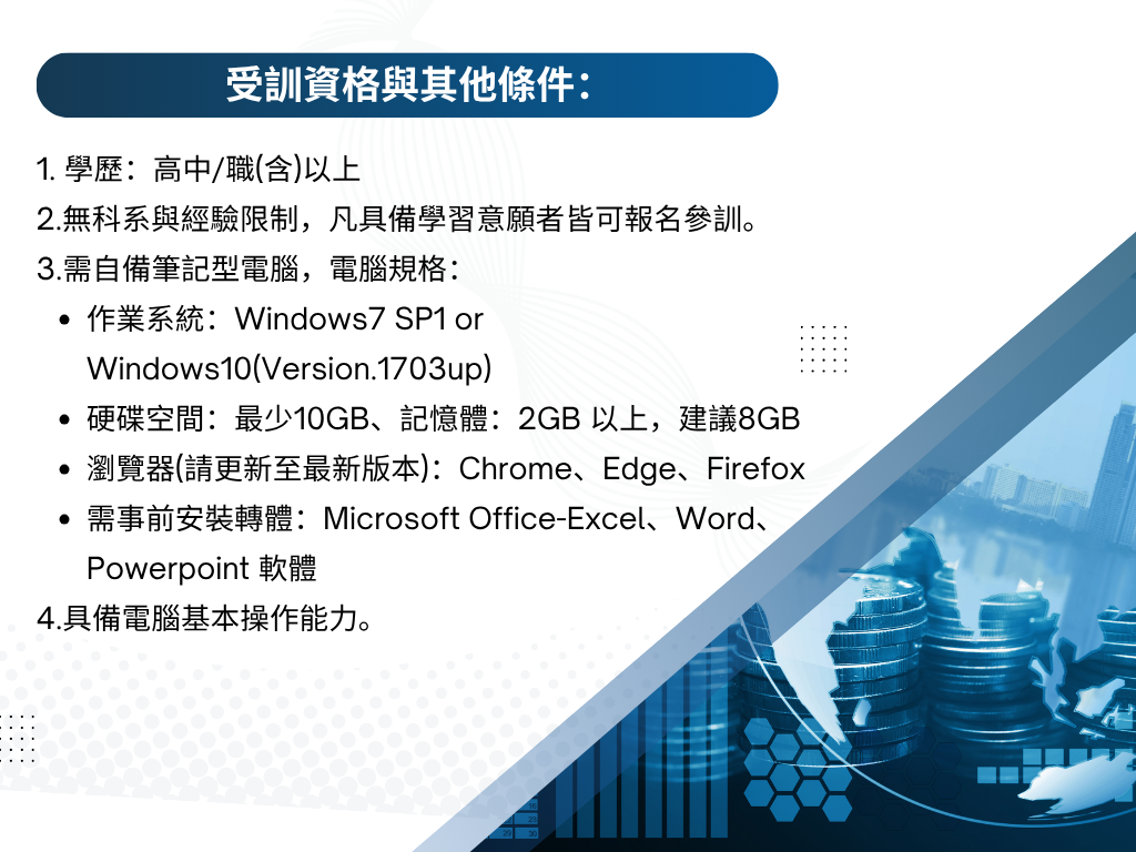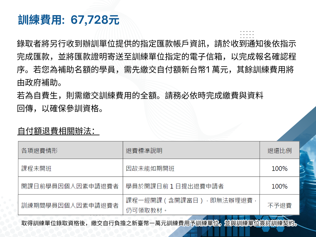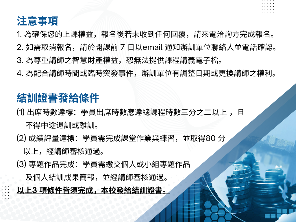 4.登記參加本課程說明會,以協助瞭解課程內容及確認個⼈學習意願與興趣是否相符,並於說明會後參加甄試。