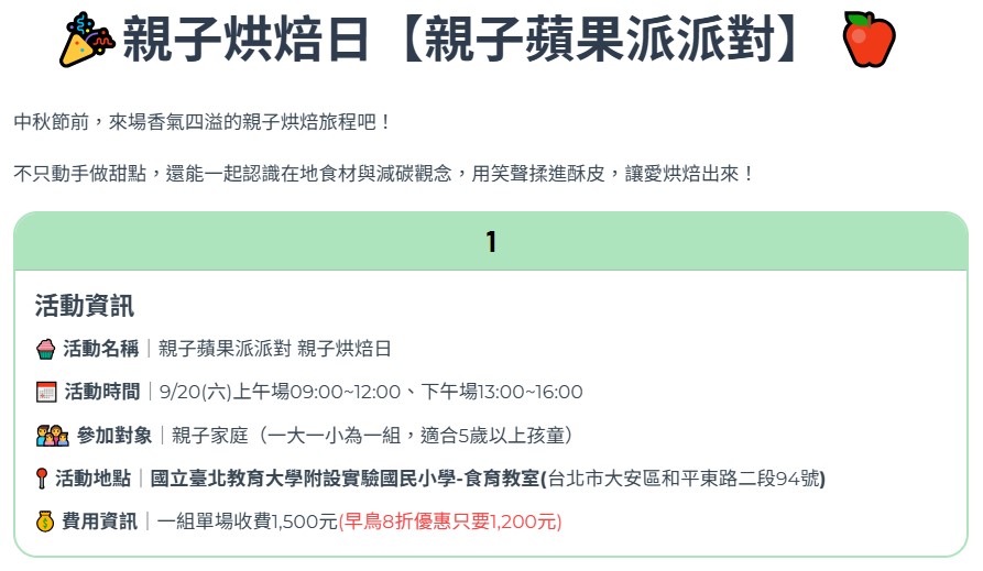 每組親子優惠價只要1200元(一組為一位大人與一位孩童,適合5歲以上孩童),材料費250元另計(請於課堂上繳交給老師)