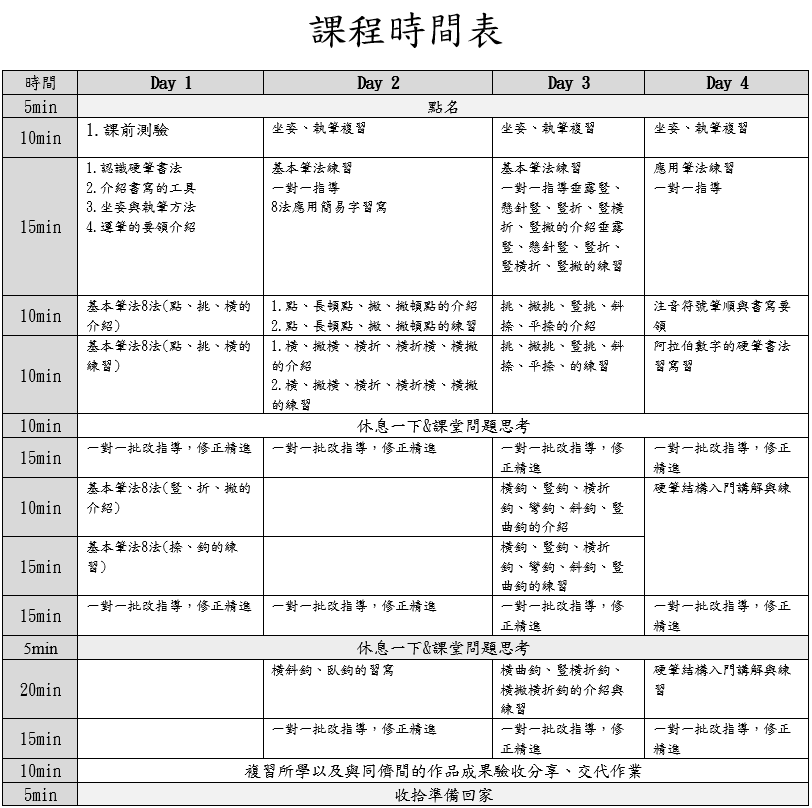 1.課前測驗 2.認識硬筆書法 3.介紹書寫的工具 4.坐姿與執筆方法 5.運筆的要領介紹 6.基本筆法8法(點、挑、橫、豎、折、撇、捺、鉤的習寫 |