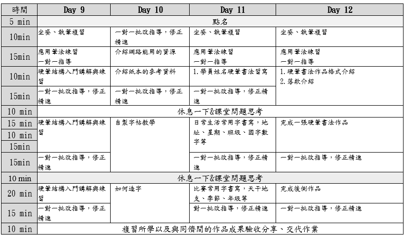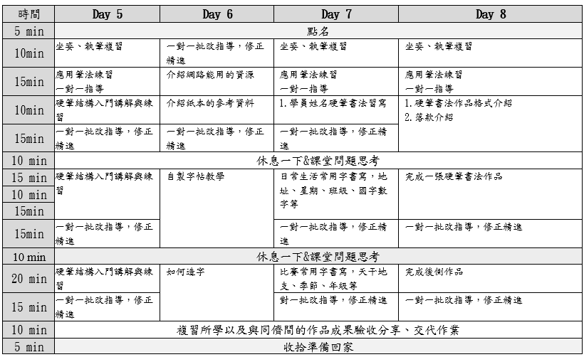 1.學員姓名硬筆書法習寫 2.日常生活常用字書寫,地址、星期、班級、 |