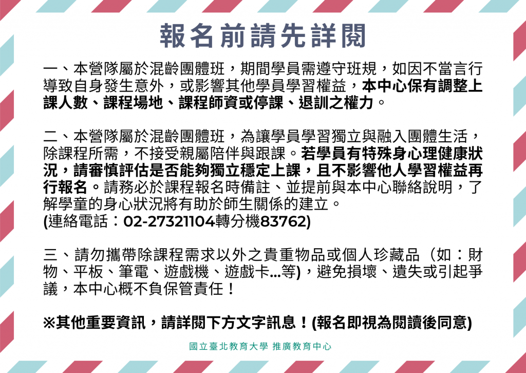 ※ 報名前請務必先詳閱本中心報名頁面中所有訊息及轉班、退費、補課、政府公告停課之相關辦理方式(點選查閱),避免損失權益,報名即同意本中心營隊所有行政程序與規則。